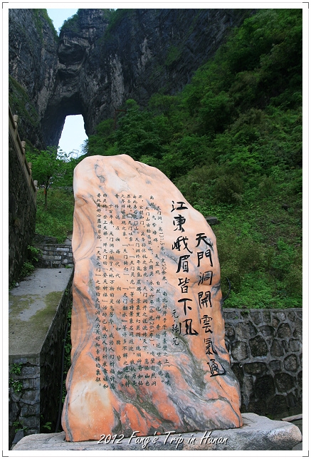 山腳下石碑,上頭有元朝詩人張兌寫的「天門洞開雲氣通,江東峨眉皆下風」,讚嘆天門山的氣勢磅礡